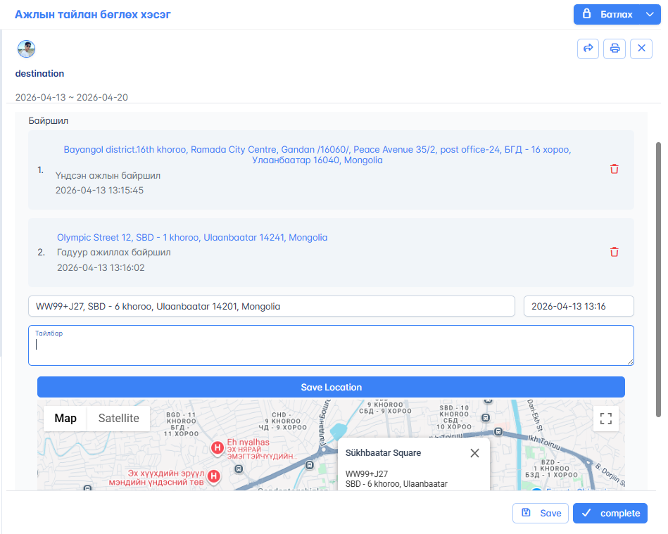 - Multi-Location Mapping: Ажлын урсгалын байршил (location pin) хэсэгт олон байршил оруулах боломжтой боллоо. Тэмдэглэсэн цэг дээр дарахад шууд Google Maps руу шилжинэ.