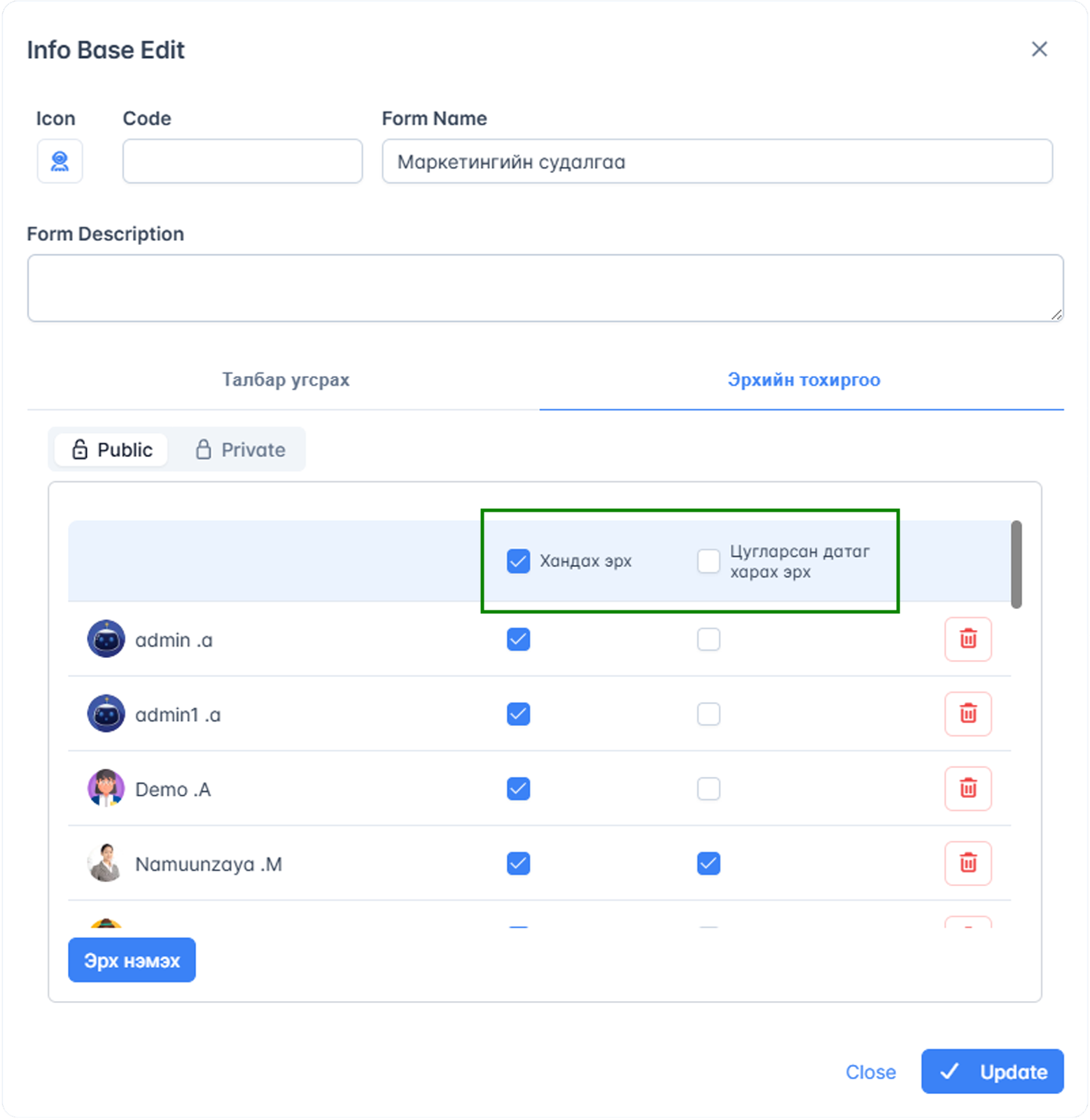 Мөн маягтыг үүсгэхдээ эрхийн тохиргоог нь тохируулан үүсгэдэг боллоо. Энэ нь мэдээллийн аюулгүй байдлыг илүү сайн хангадаг болсон байна